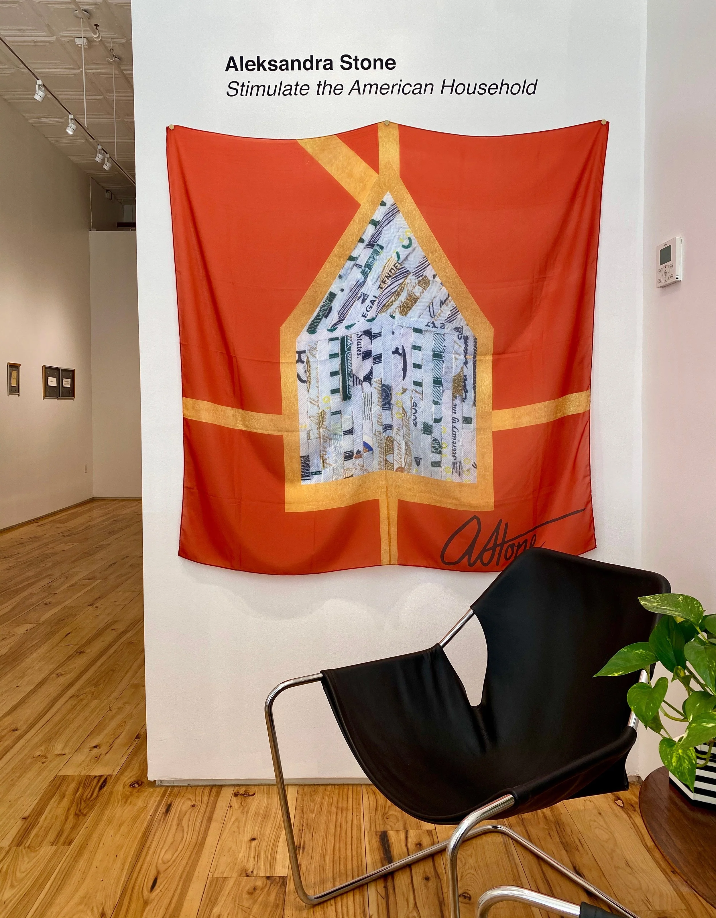 Aleksandra Stone: Stimulate the American Household features 19 works consisting of shredded US currency, meticulously sorted and arranged by the artist into provocative statements on the current economic realities of COVID-19. The works have been “framed” in vintage window screens reminiscent of the artist’s first impressions of American life when her refuge family arrived in Kentucky (from Yugoslavia) when she was 10 years old.