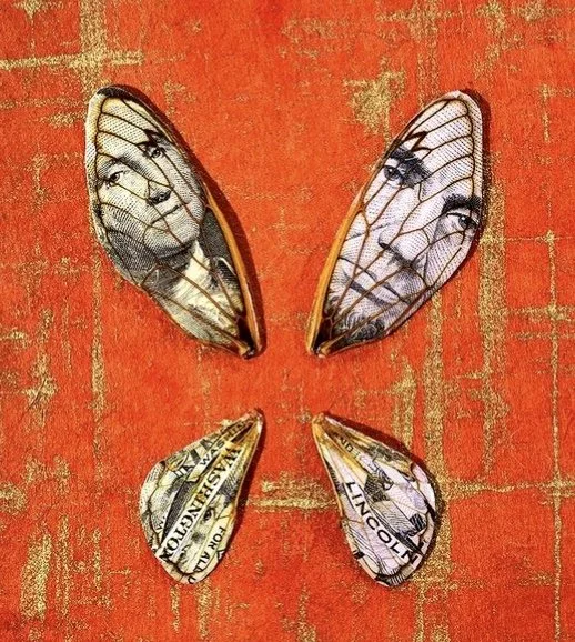 Image: Aleksandra Stone, Of Wings and Money Men, 2021, cicada wings and shredded US currency on paper, 4 1/2 x 6 1/4 inches (11.4 x 15.9 cm)